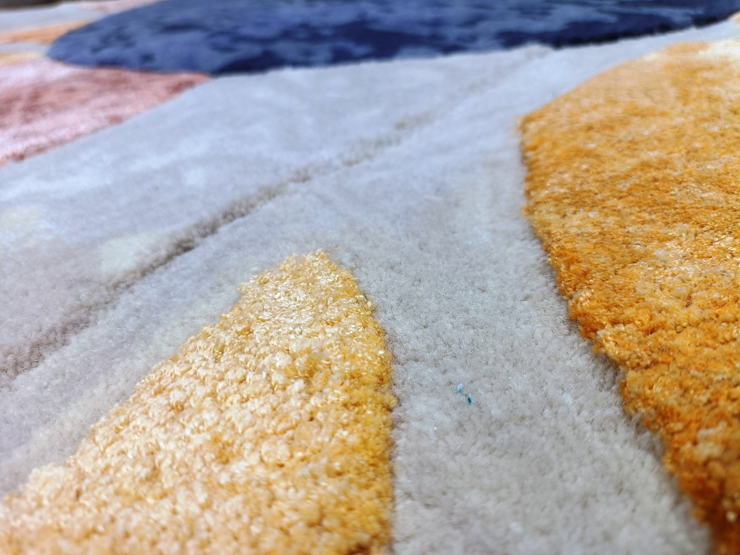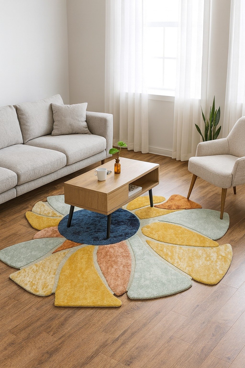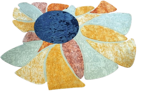 Designed with a palette of muted sage, sun-drenched ochre, and deep navy, it effortlessly anchors neutral furniture while adding a sophisticated pop of color. Its unique scalloped edges break away from traditional rectangular boundaries, making it the perfect focal point for minimalist or mid-century modern interiors.