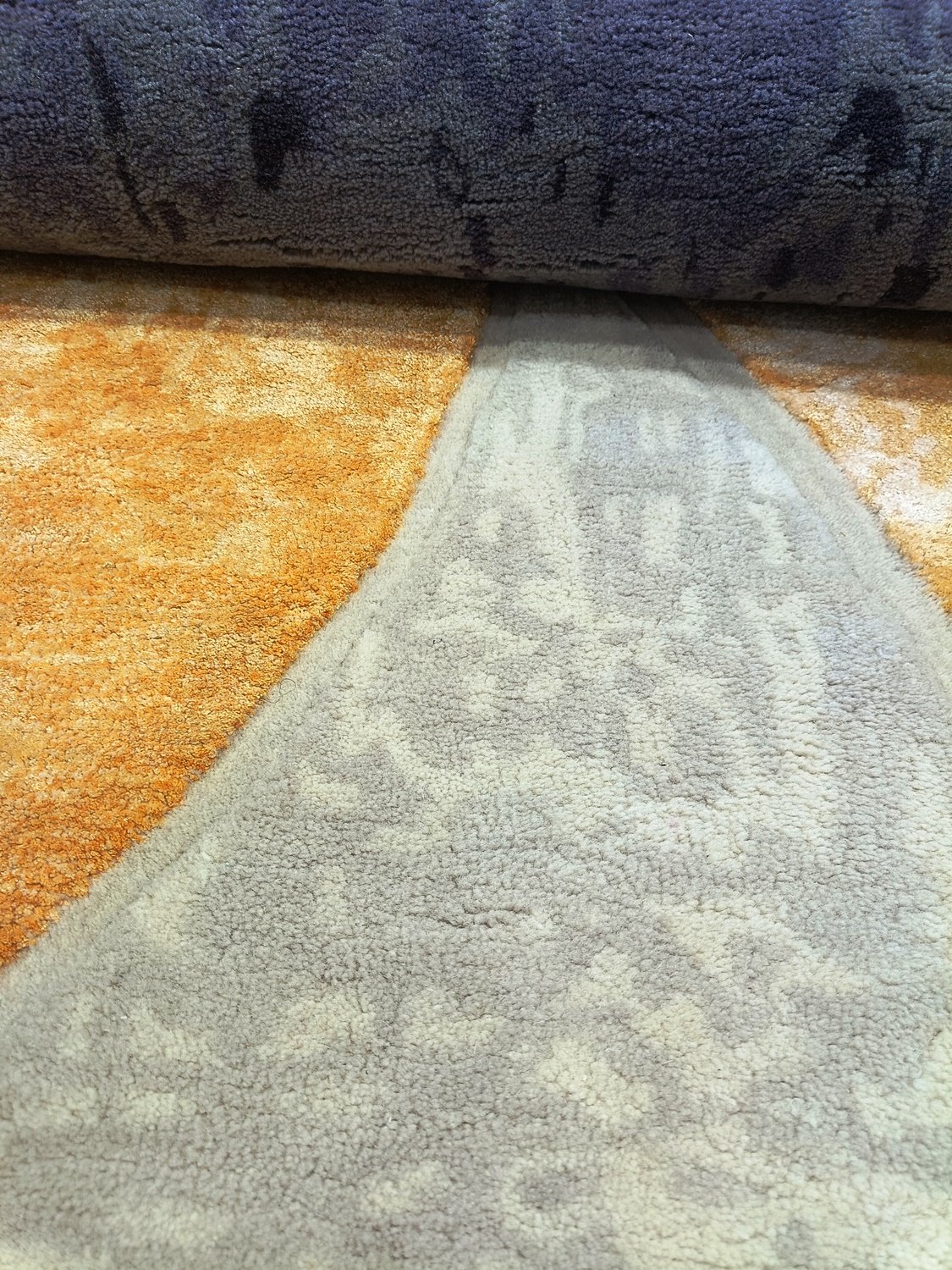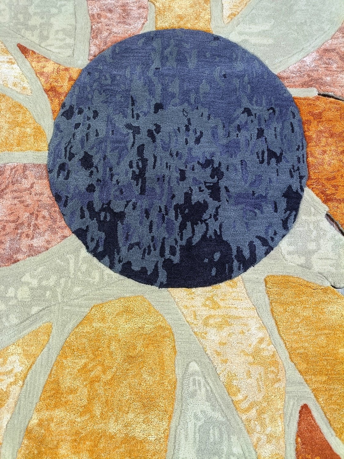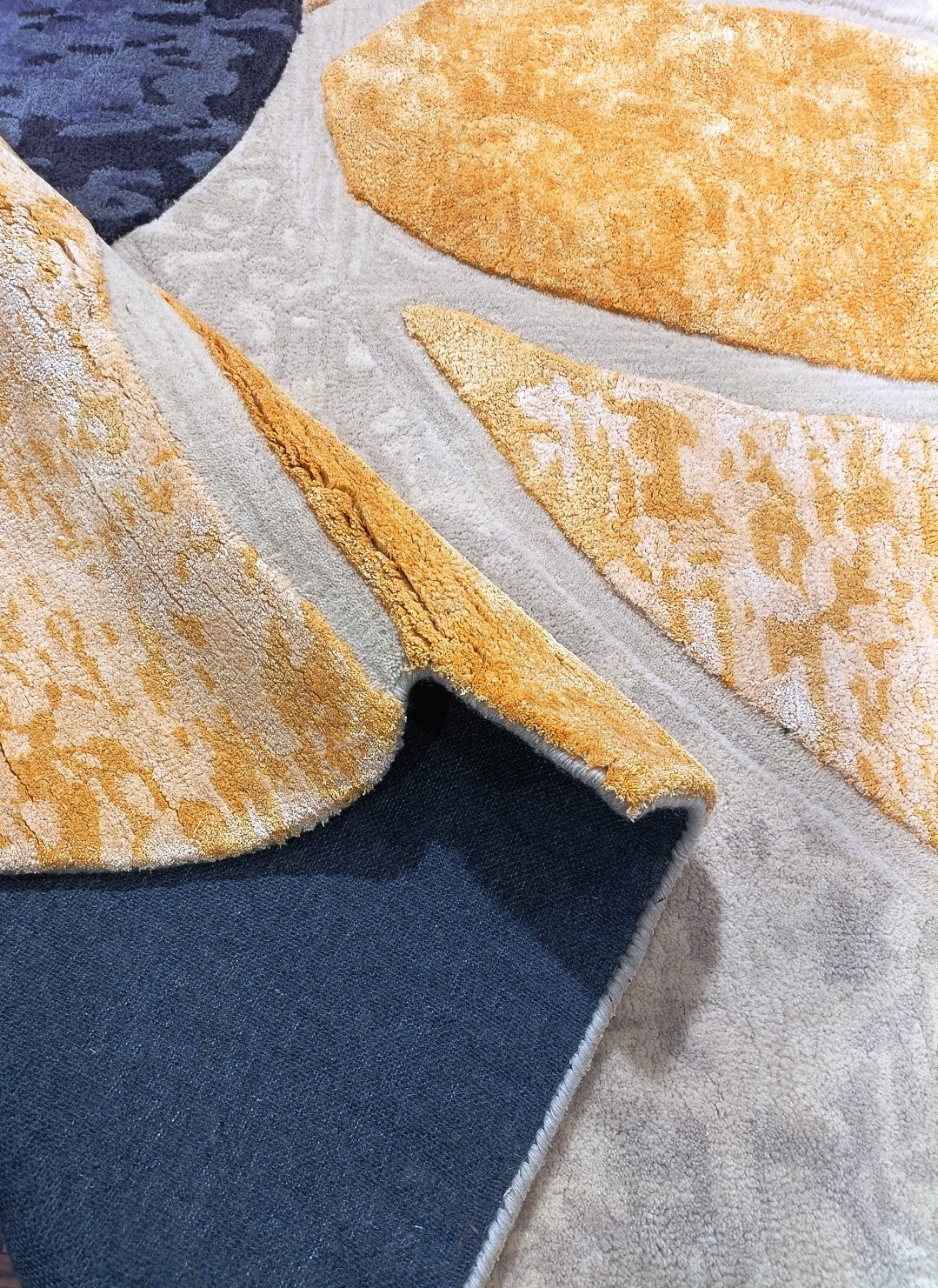 Designed with a palette of muted sage, sun-drenched ochre, and deep navy, it effortlessly anchors neutral furniture while adding a sophisticated pop of color. Its unique scalloped edges break away from traditional rectangular boundaries, making it the perfect focal point for minimalist or mid-century modern interiors.