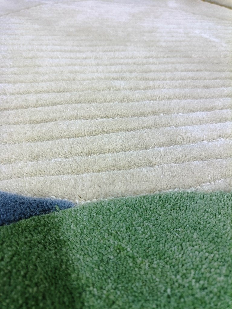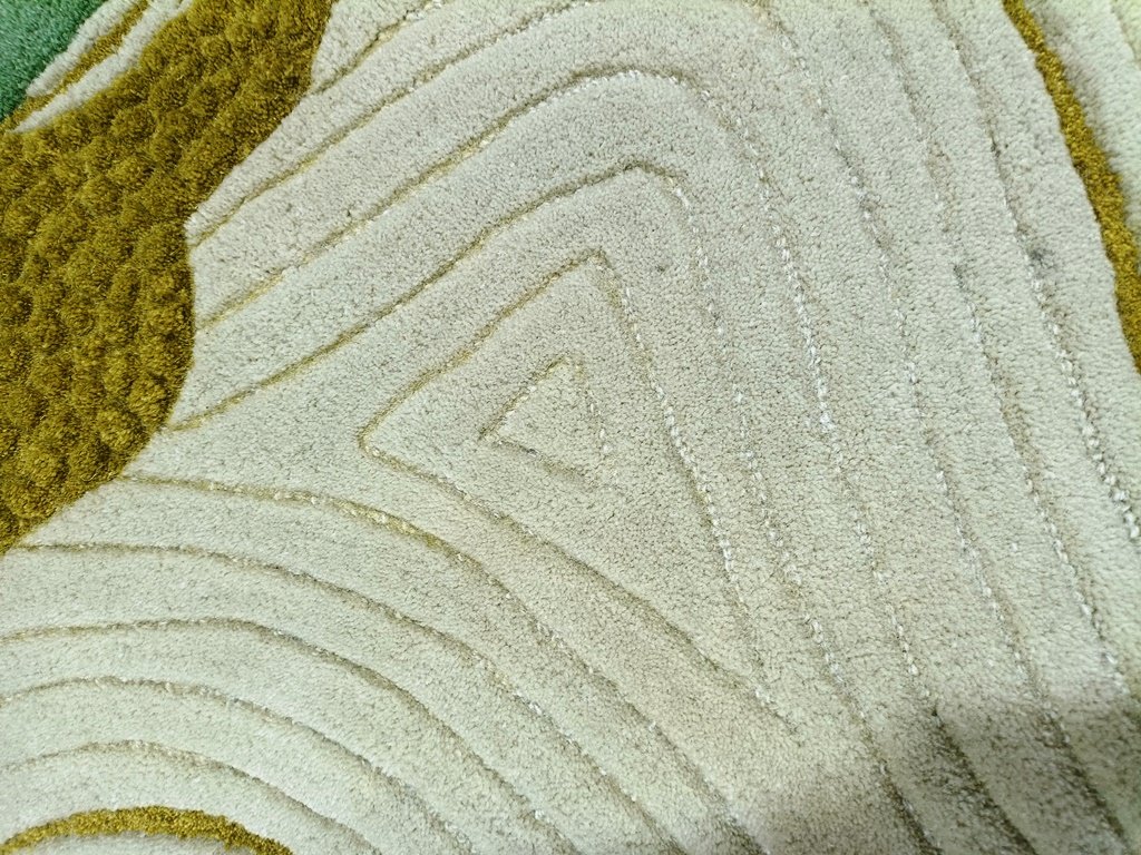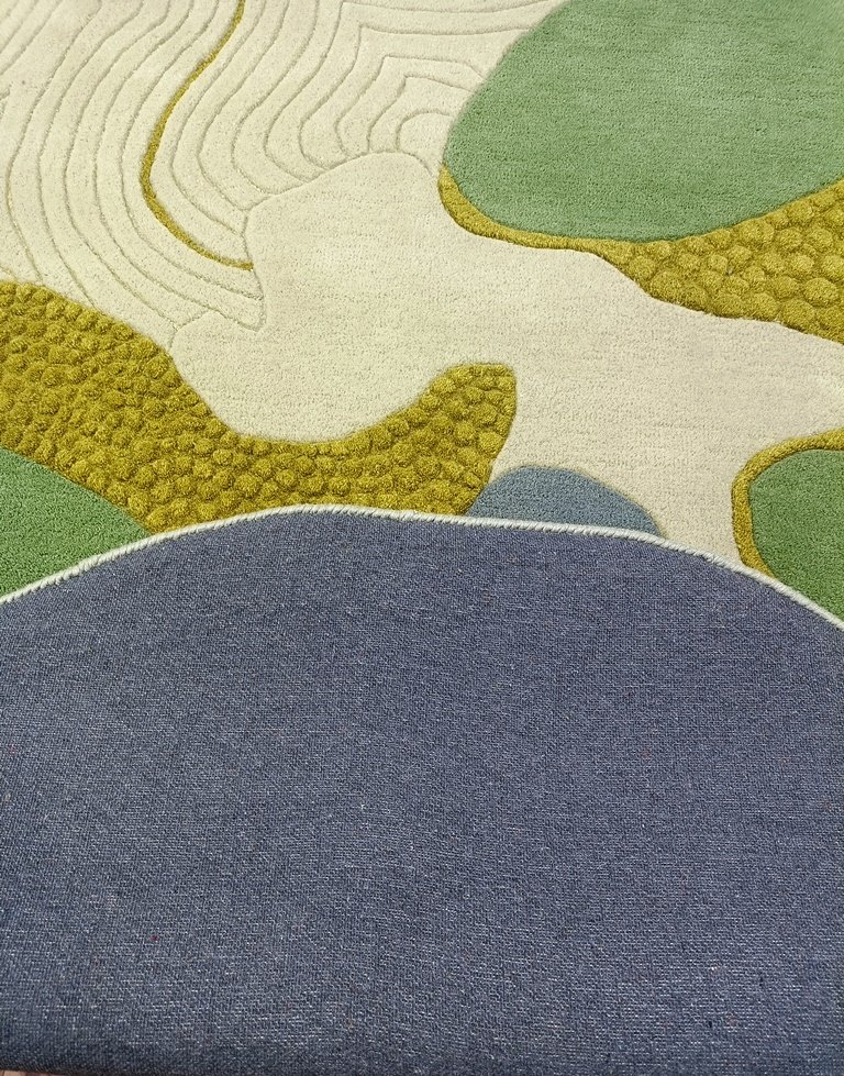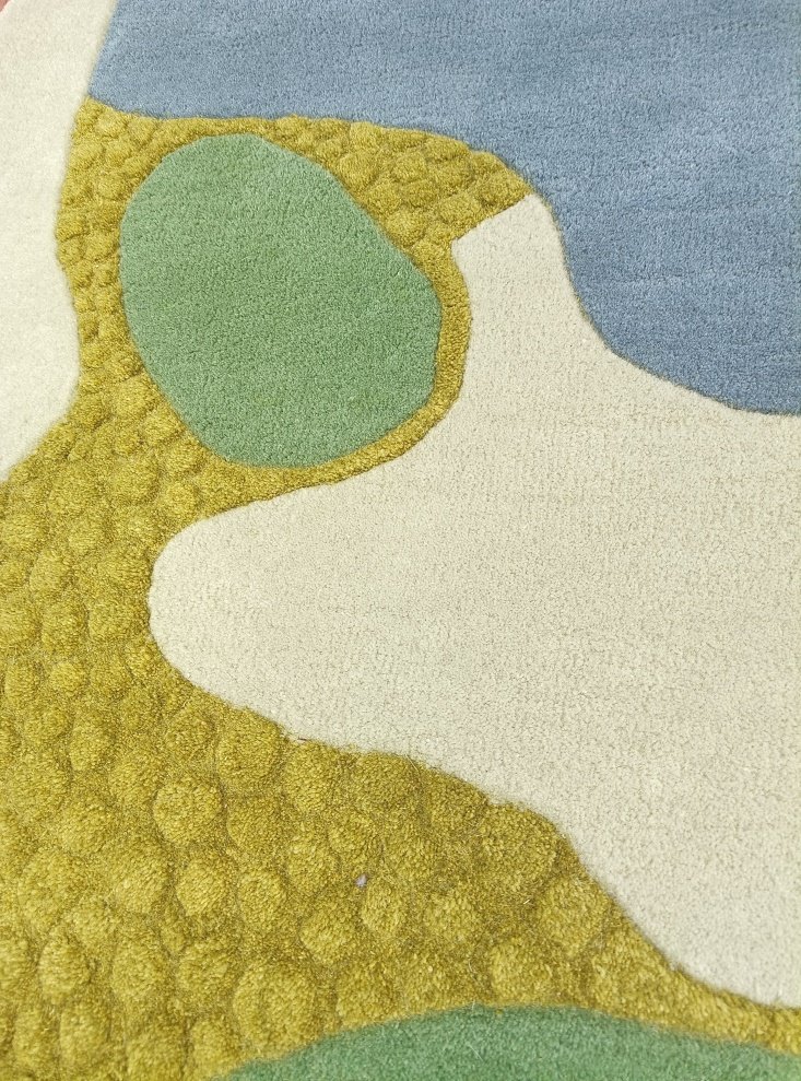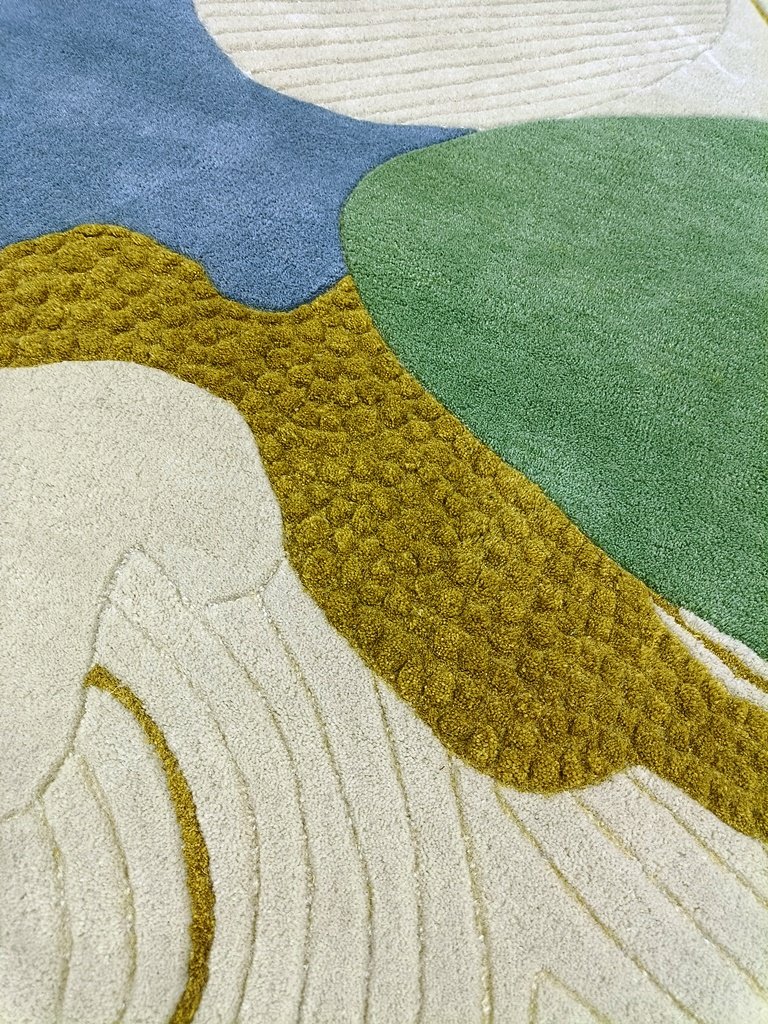 This isn’t just a rug; it’s a tactile experience. Inspired by aerial landscapes and organic rock formations, the design features a stunning high-low pile texture. The intricate, hand-carved “topographic” waves on one side provide a sensory underfoot feel, while the smooth, bold color blocks in Sage Green, Ochre, and Slate Blue create a grounding focal point.