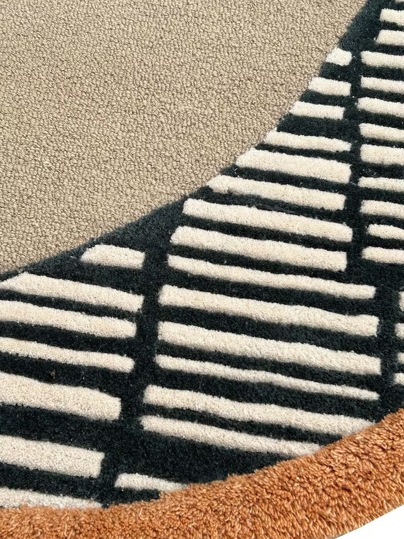 The design features a striking contrast between a vast, calm neutral field and a bold, geometric linework section in monochromatic black and white. A warm, terracotta-toned border adds a dimensional pop, framing the unique shape and making it a focal point for any room.